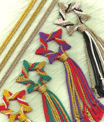 Follow these directions to choose your own colors. Stars have two colors of cotton, plus gold metallic. Choose any two cotton colors from the color chart below. The gold cords will have gold metallic plied with your choice from these three cotton colors -- Gold, California Gold, or Beige, as shown in the photo here. Indicate which color should be the accent, and which should be most dominant. Feel free to e-mail me with any questions or special requests.