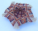 The Venus basket has a 5-cord start, which leads to a pentagon and then to a 5-pointed star for the basket base. Shallow cylindrical sides have triangles extending from the star. A long rim cord circles the basket 5 times, as cord ends are pulled through it. Finished dimensions: 2-1/2" tall x 5" wide.