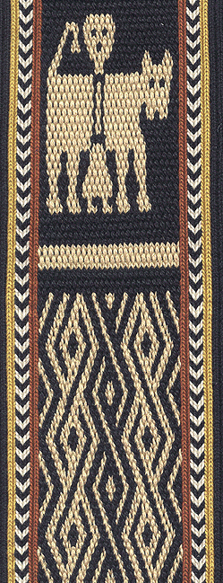 The two figures -- the queen's attendant and the lion and the saint -- are from the 18th century tablet-woven silk curtains from a church in Ethiopia. For more information about these curtains, see "Tablet-woven Curtains from Ethiopia: New Light on a Puzzling Group of Textiles" by Martha Henze, The Textile Museum Journal, 1999-2000, pages 84-100.