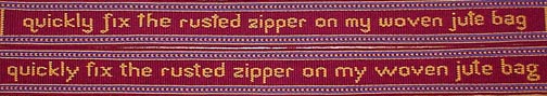 Here is a pangram woven using two slightly different versions of letters based on the typeface Gill Sans, designed by Eric Gill. The pangram "quickly fix the rusted zipper on my woven jute bag" is one of several that I made up and wove while working on my book Please Weave a Message. A pangram contains every letter of the alphabet ("the quick brown fox..."), and is used to show the "look" of a script or font.
