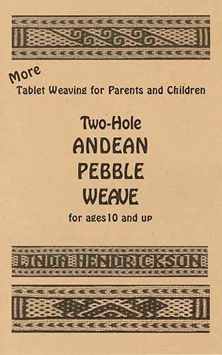 28 pages, 5-1/2"x8-1/2", self-published in 2004. This booklet is a follow-up to my article "Tablet Weaving with Children", Handwoven, November/December 2003, p. 43. Complete instructions for making a continuous warp for pebble weave, and for weaving charming traditional Andean designs with tablets. I created the graphs by analyzing bands in my collection from Peru, and also designed an alphabet for this booklet. Several words are graphed and ready to weave. All graphs are for 16 tablets. The normal corner holes are not used. Instead, use a hole puncher to make holes in the center of two adjacent edges (or you can order the tablets with extra holes). Each tablet carries one dark and one light thread. To weave, just turn the tablets individually or in groups to make the top of the shed match the row of the graph.